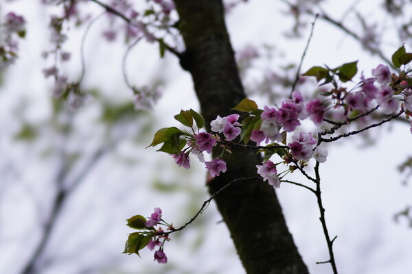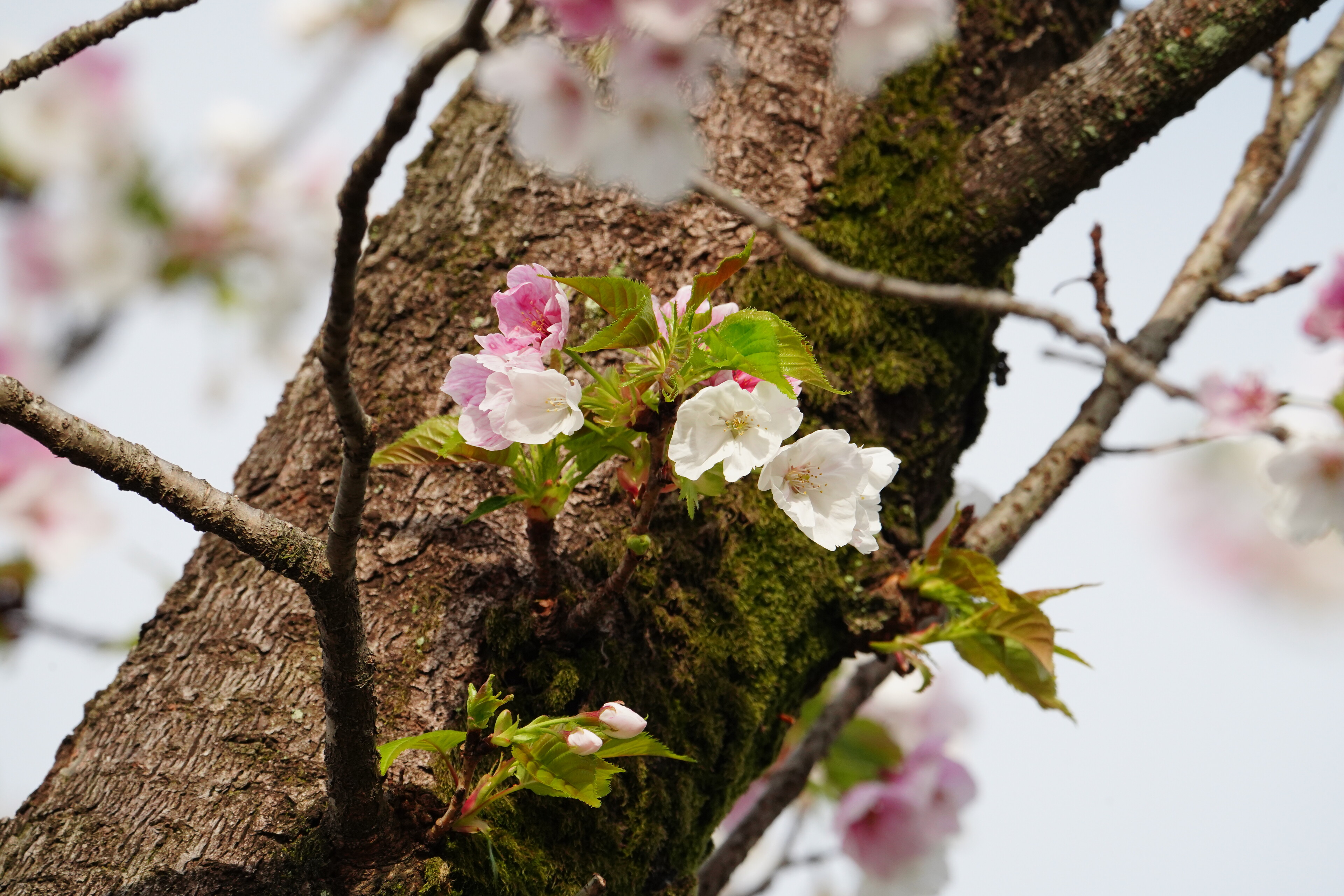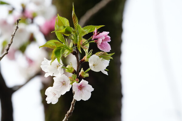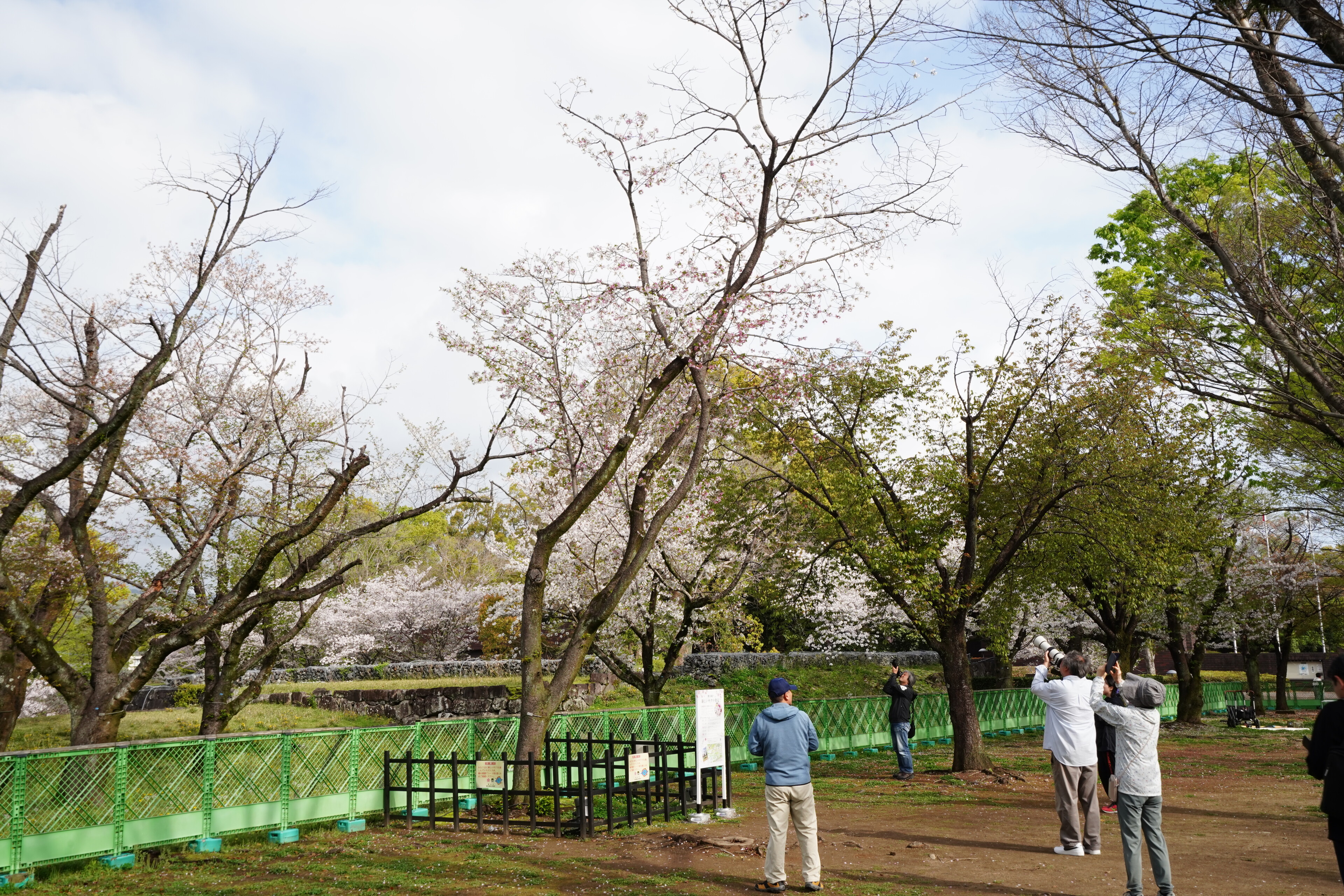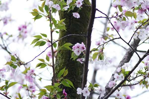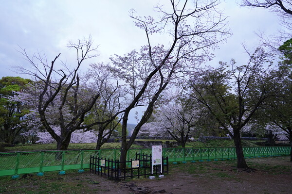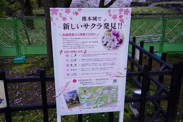 とりあえず,二の丸駐車場が 8:00 にならないと開かないので,早朝にタイムズ花畑町に止めて 6時過ぎに桜の馬場城彩苑の西側を抜けて坂を登ってってみた.看板付きの作で囲まれたちょっと斜めに伸びてるやつが件の桜.確かに紅白.でも曇ってて微妙.