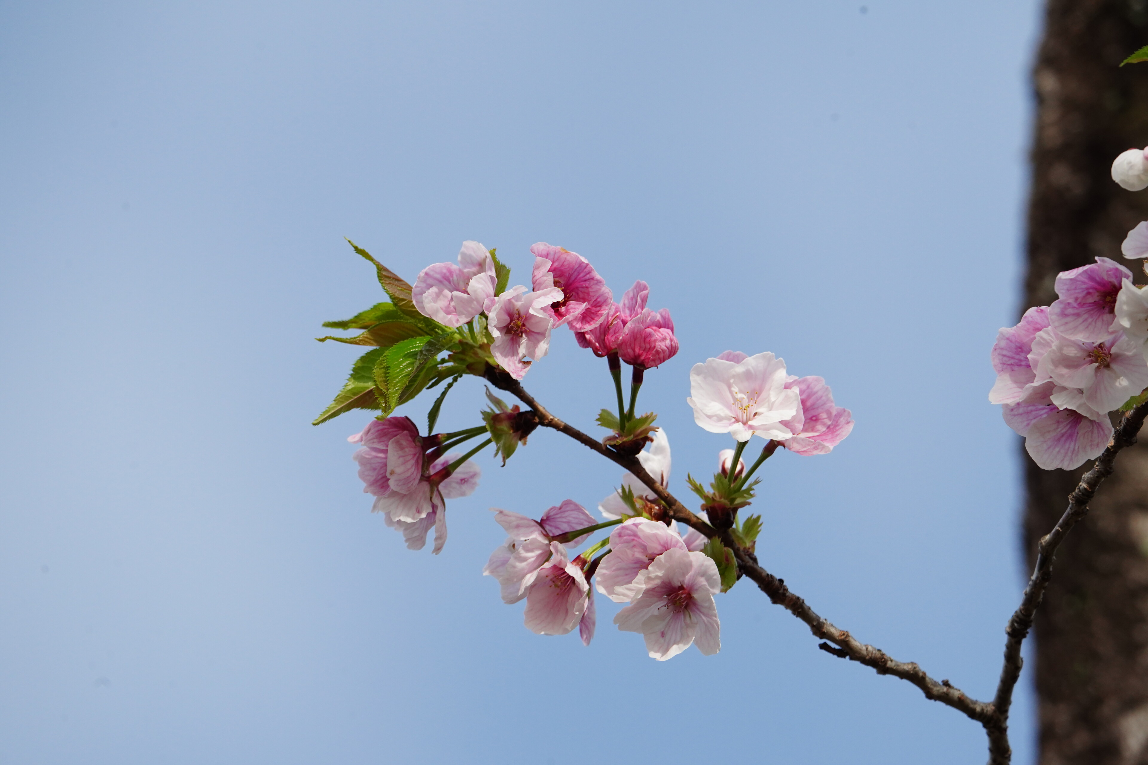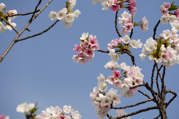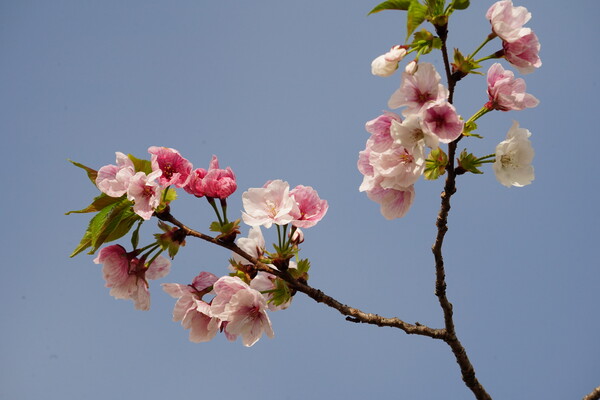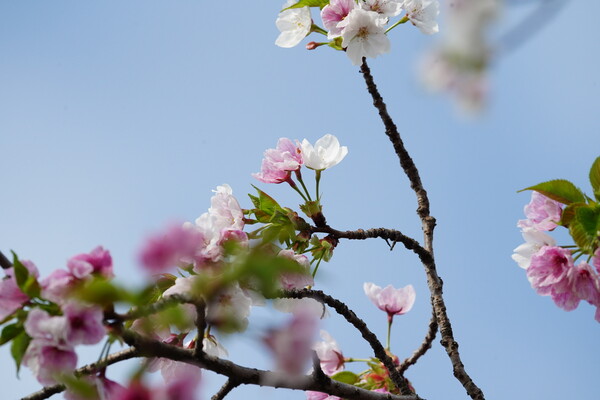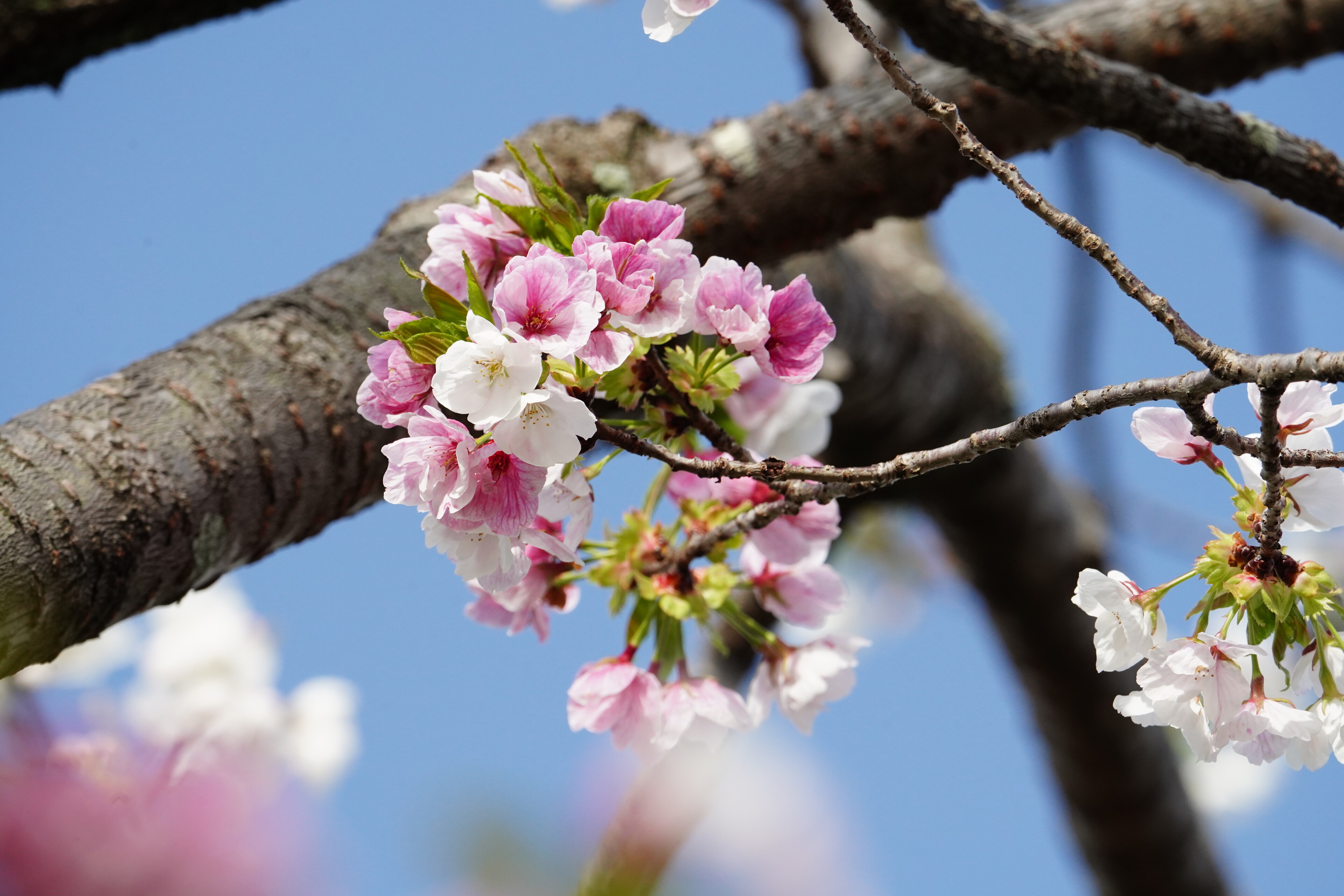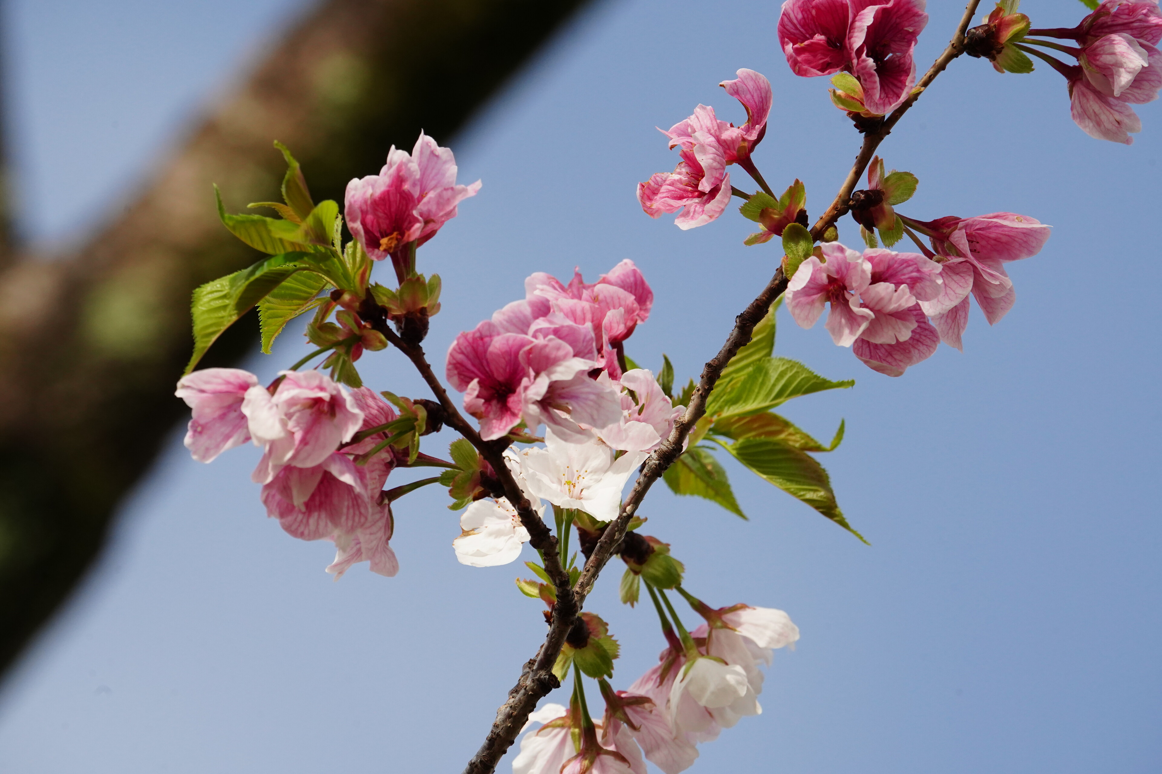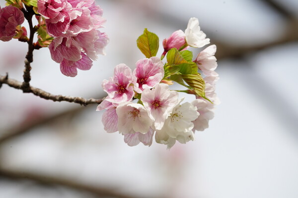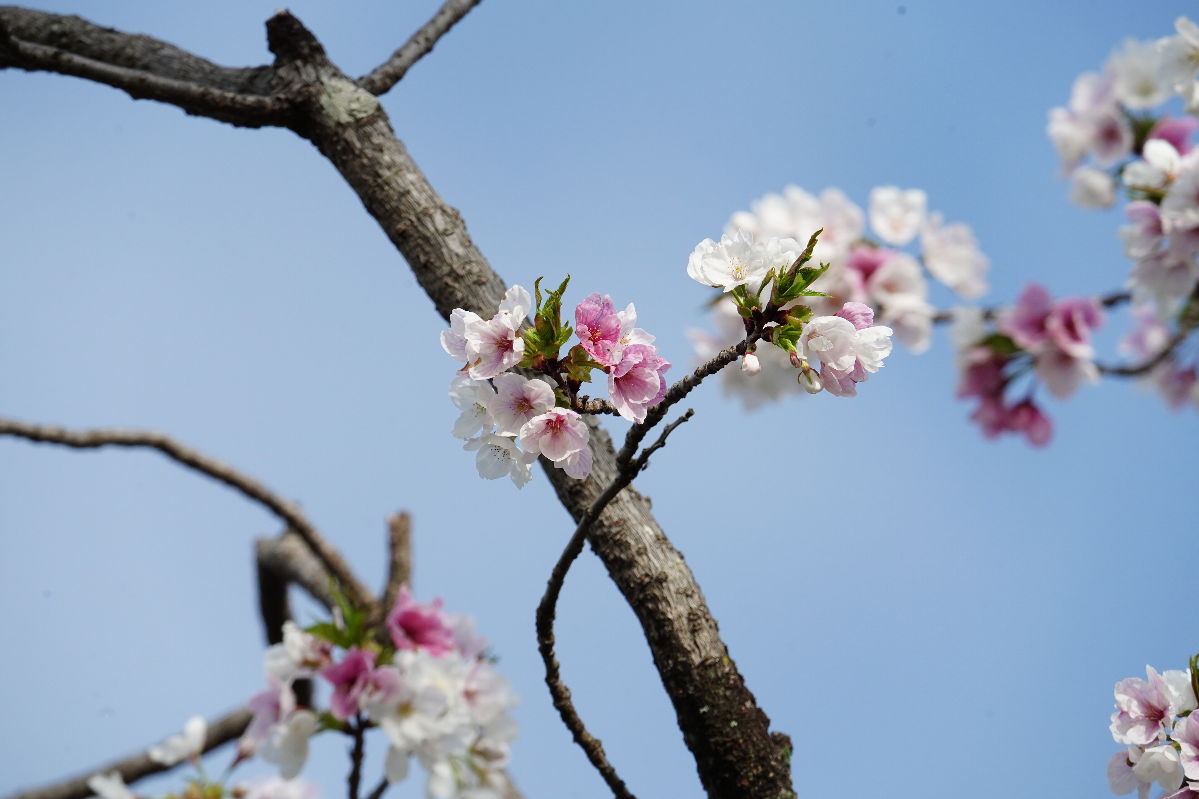 熊本城に新種の紅白の桜(咲き始めは白くて紅に染まってく桜)を見に行ってきた.二の丸広場の南西の端の辺りにあるやつ.