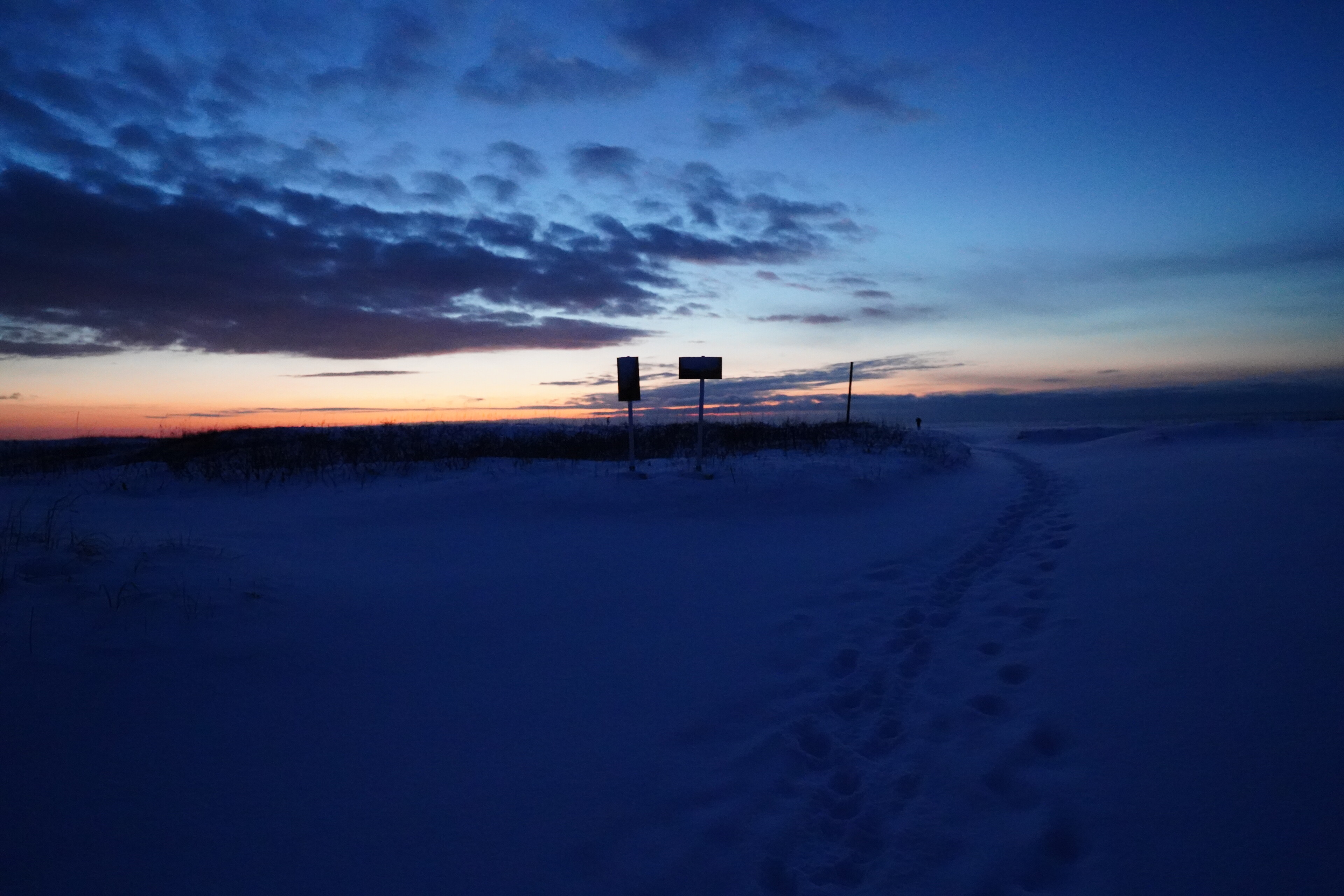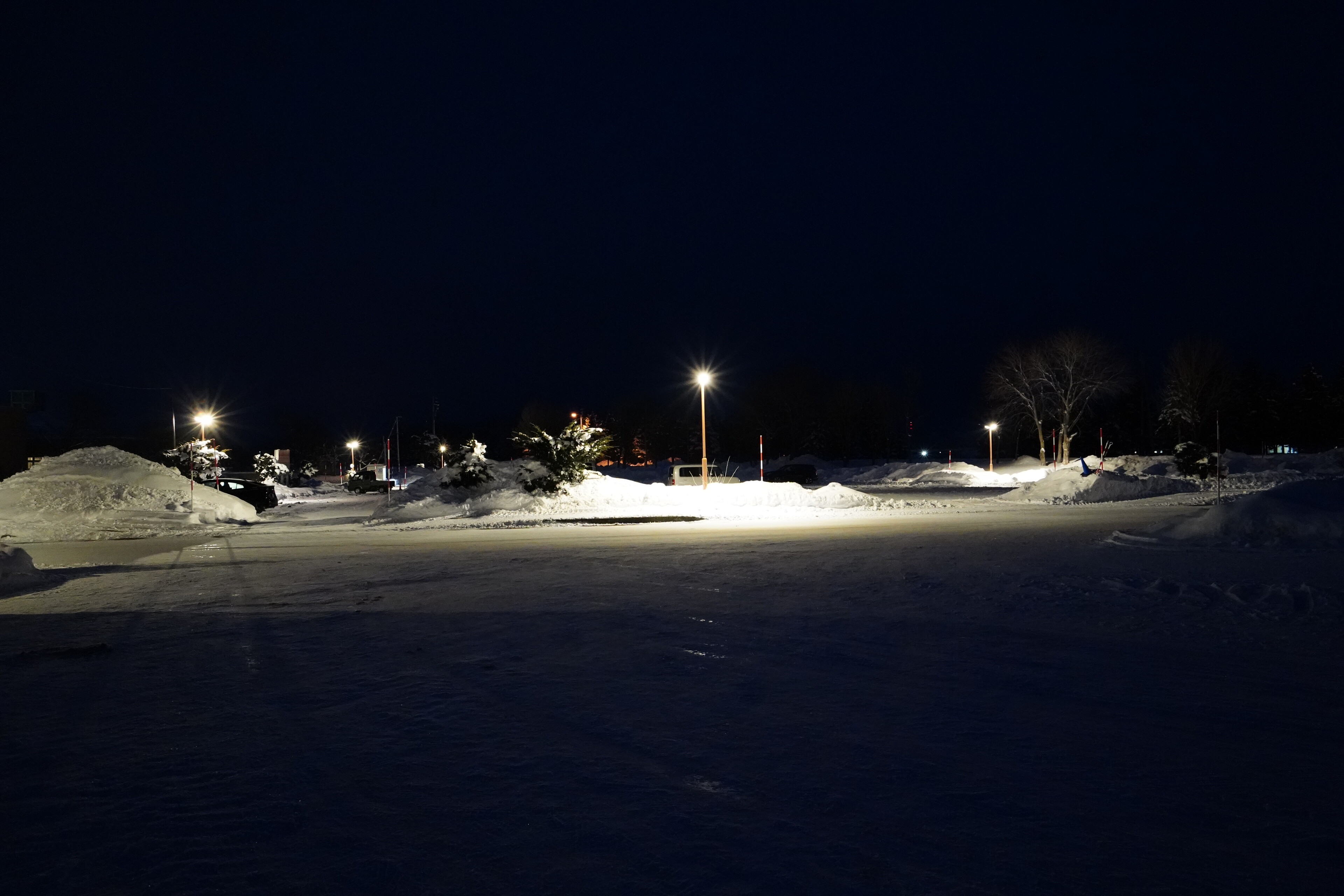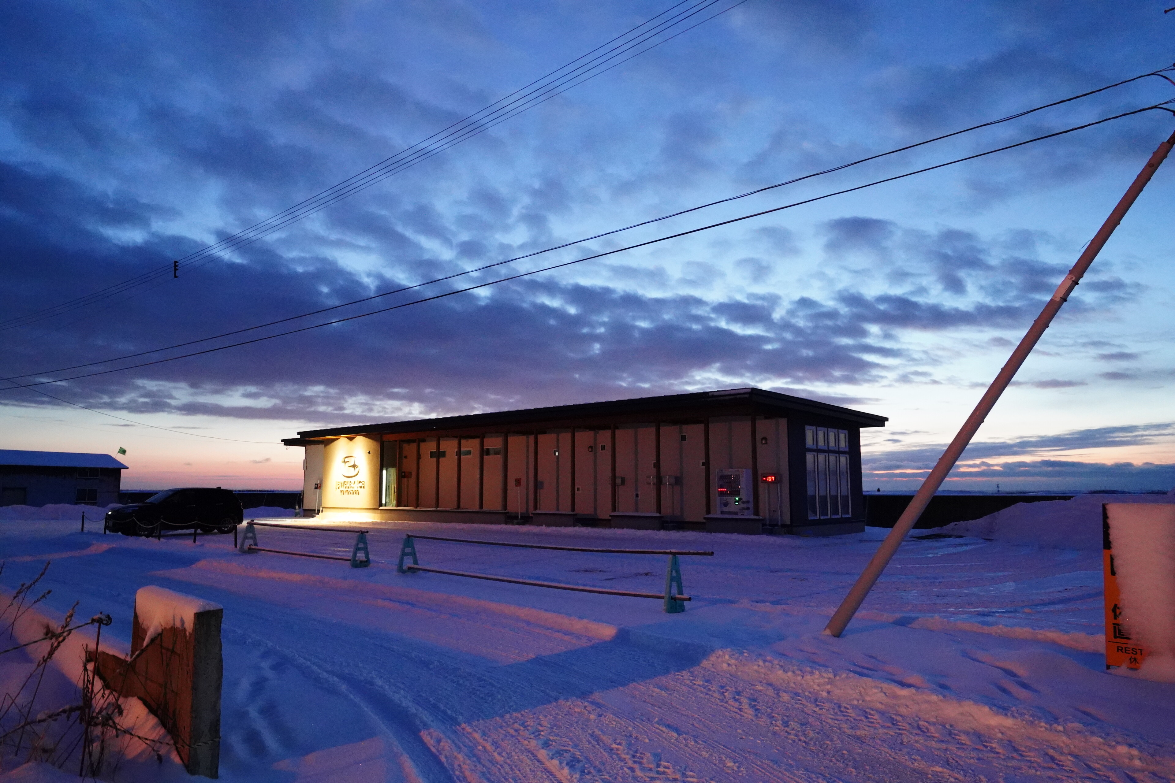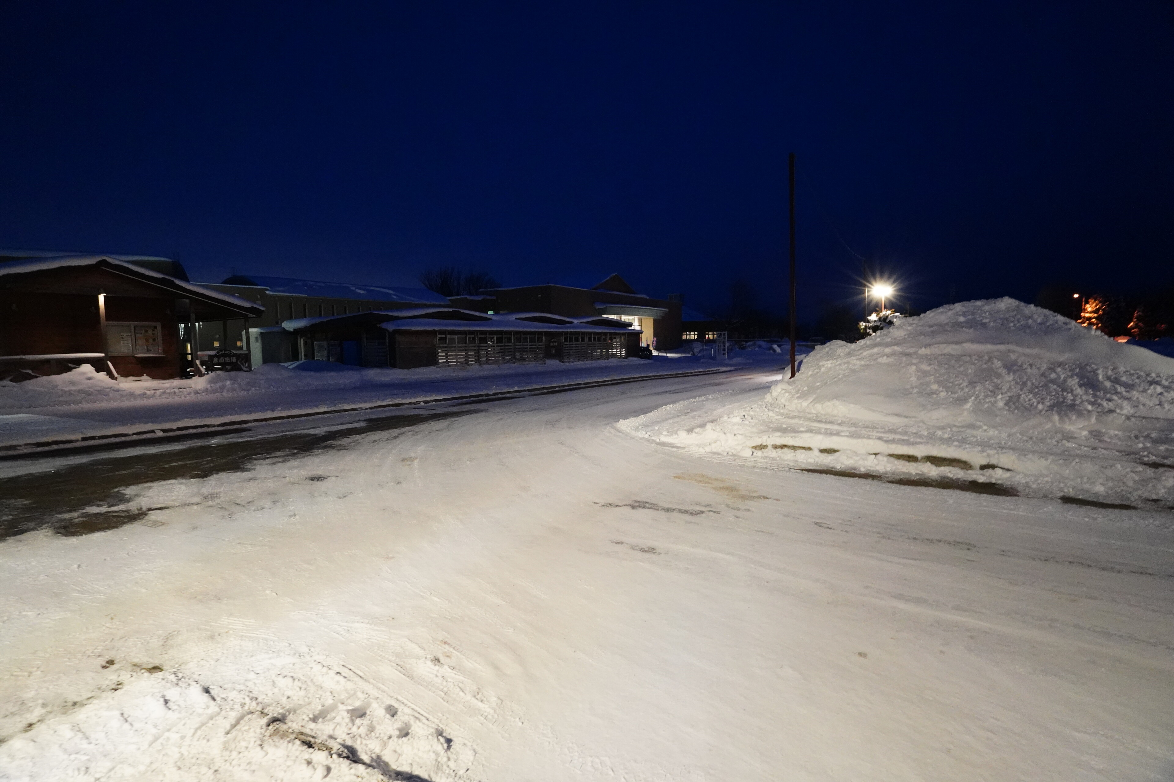 夜明け前の道の駅しんしのつ.ここらも大きな雪山が.そして手袋してないと手が痛い.
