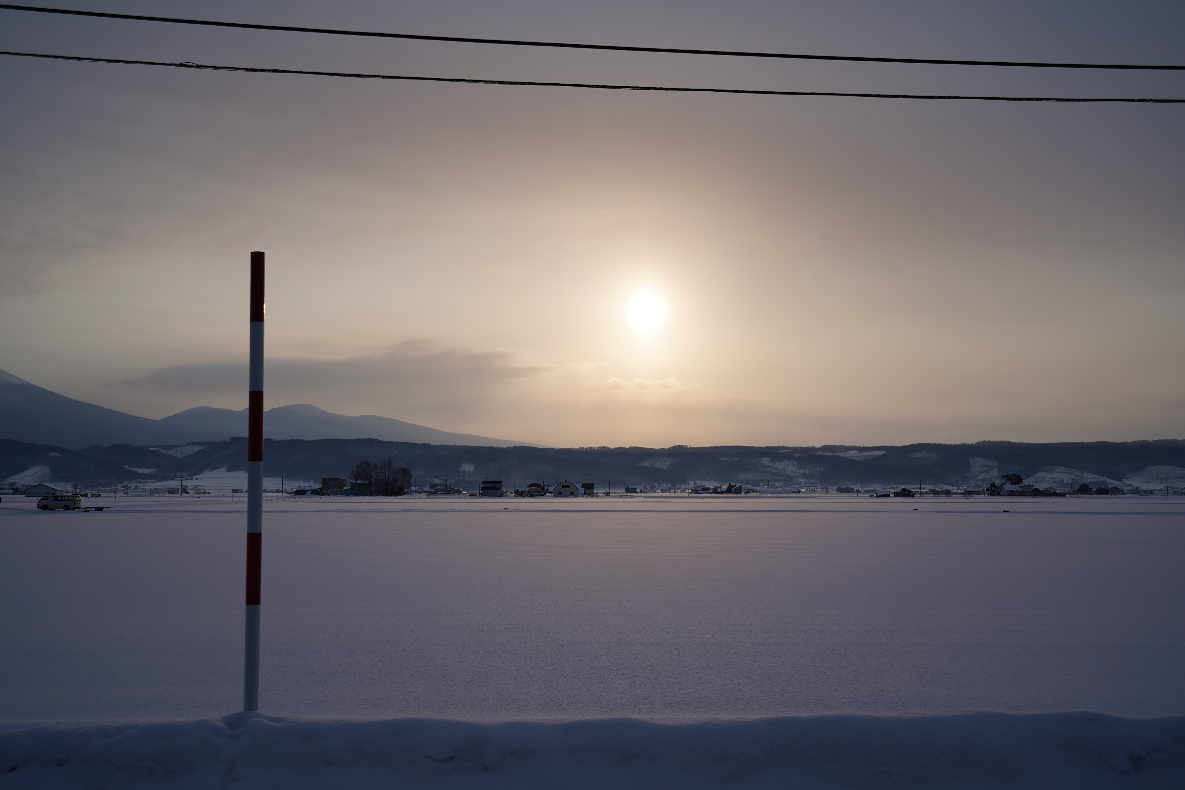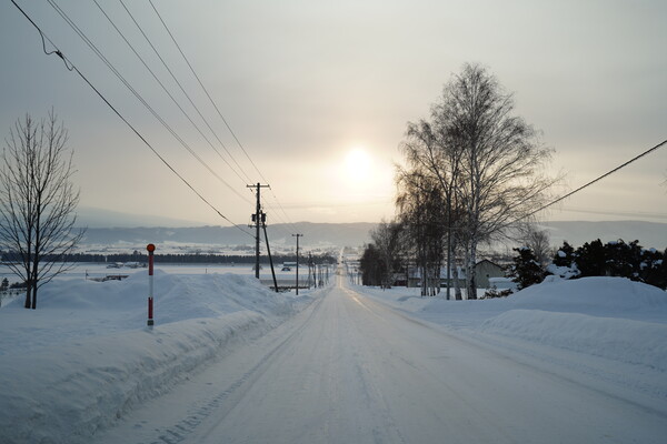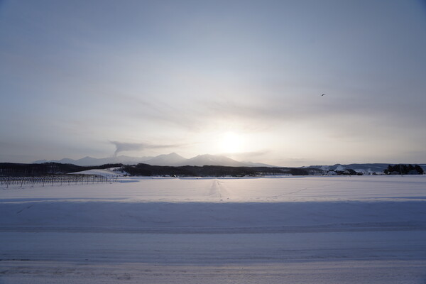 その後 R452 に入って三段滝に向かって下ってく最中のカーブで 2回ほど滑りつつ,日が昇ってきたところで富良野に入った.ここらは畑が真っ平らな雪原になってていい景色.