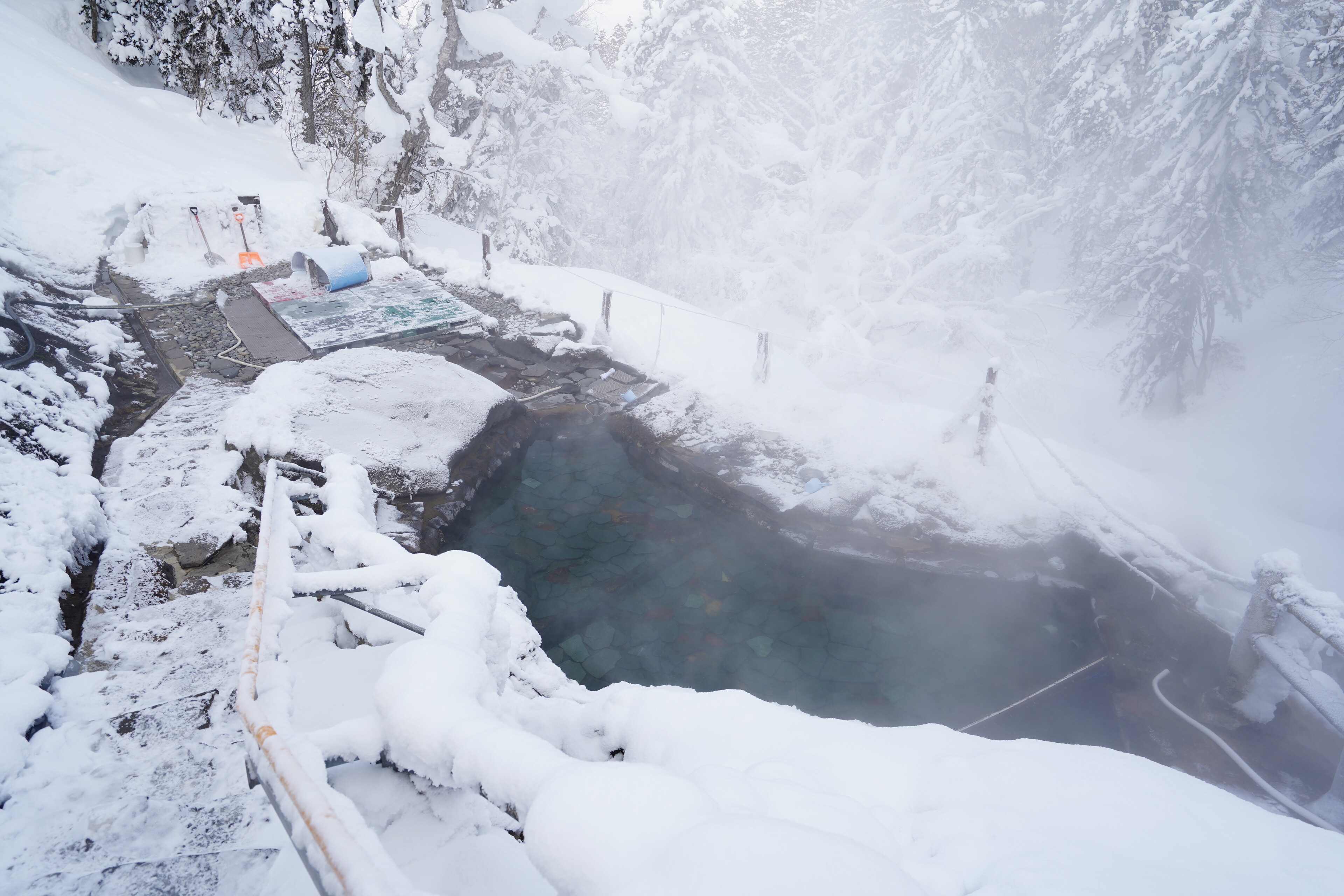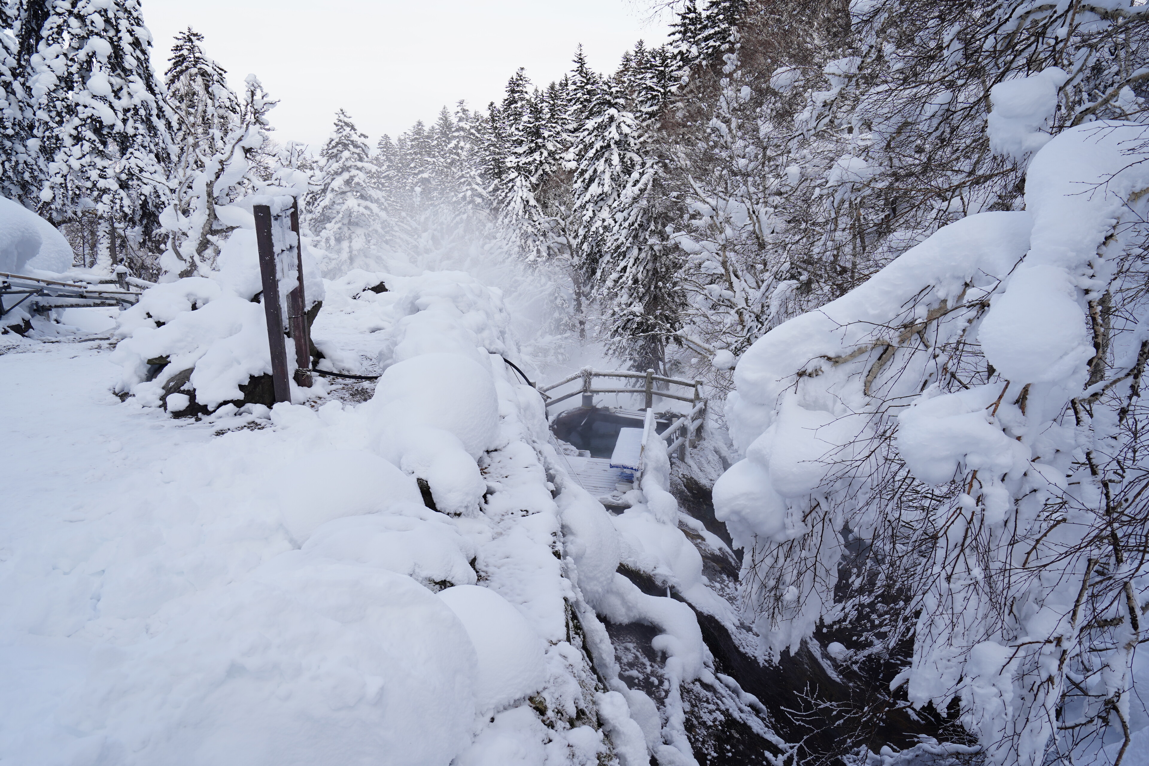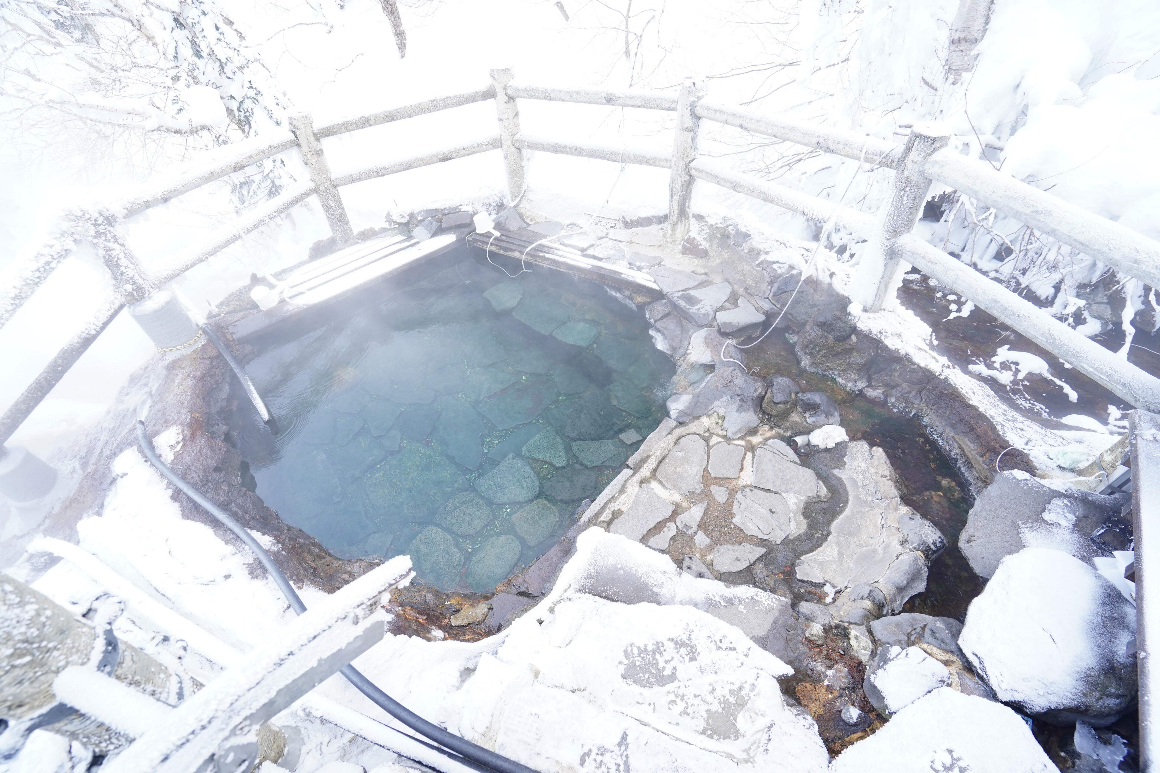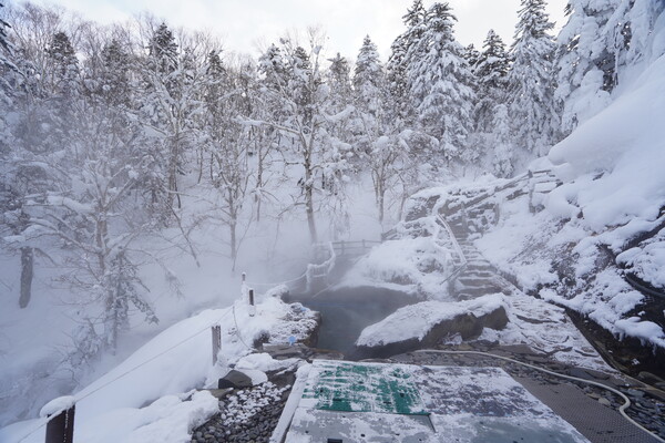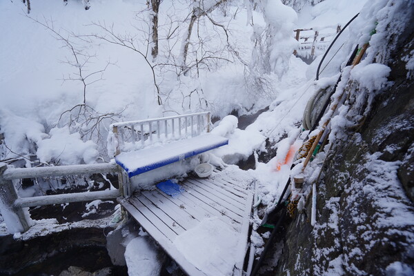 露天風呂は駐車場横の川の雪景色が楽しめた.若干の硫黄臭がしつつぬるっとする感じのお湯で,平日の15時とかだったので広い湯船を独占する感じだった.とても満足.温泉のためだけにここまで来るかと言われると悩ましいけれど.