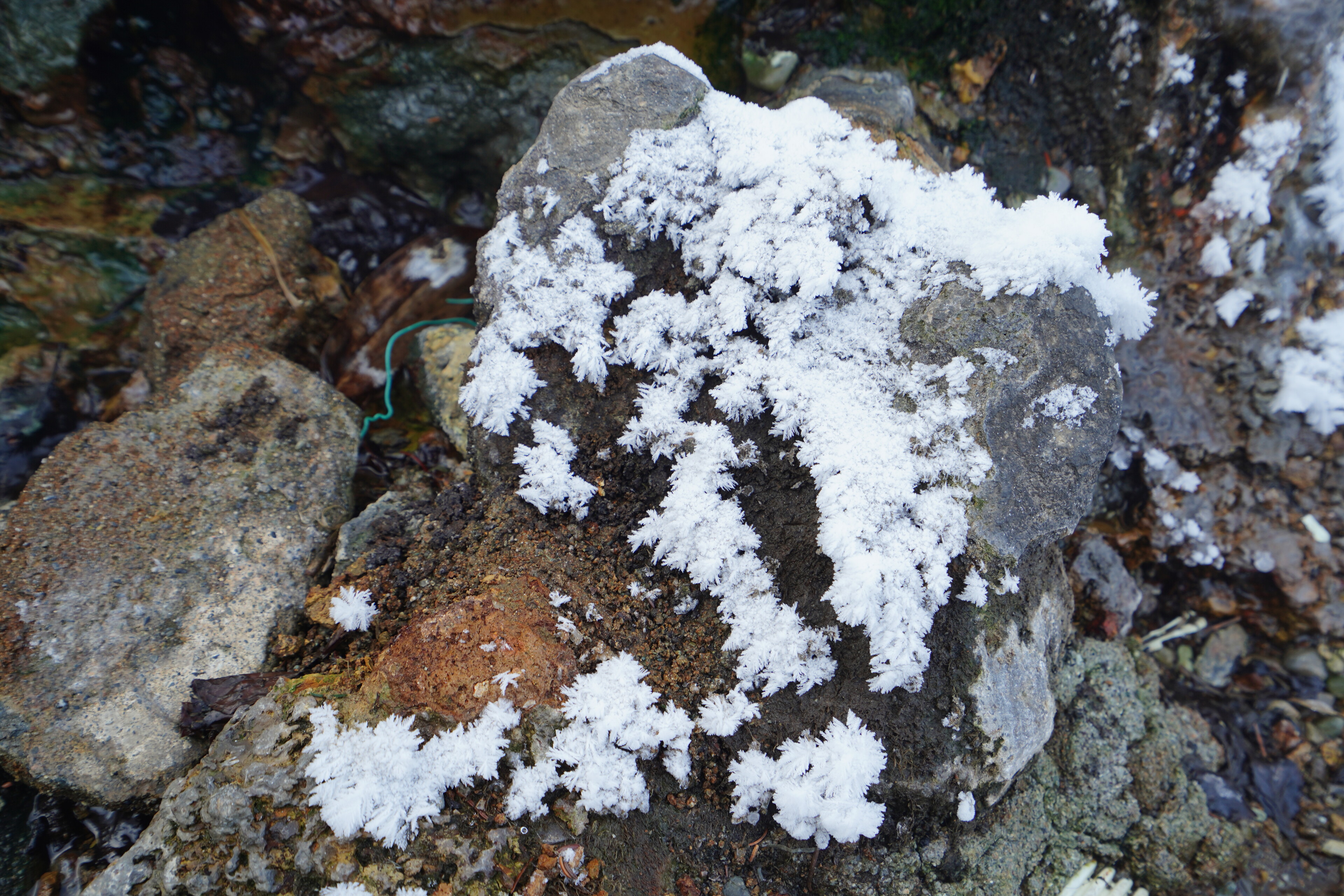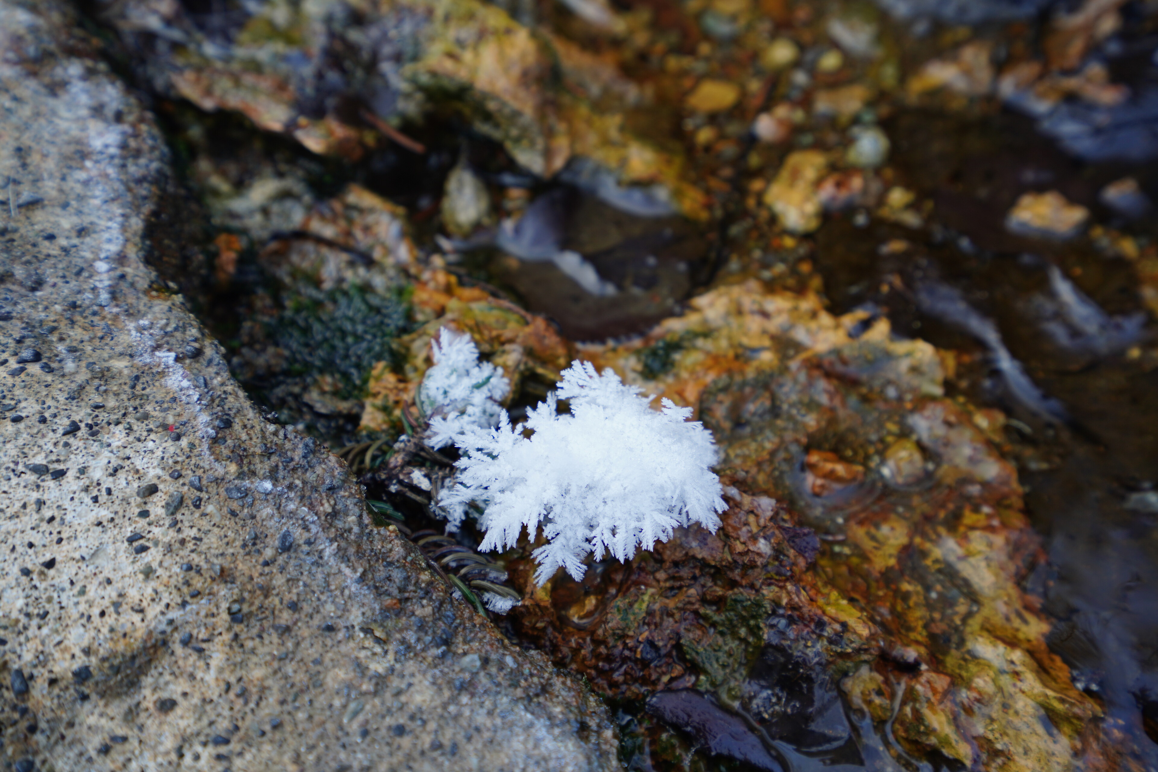ついでに温泉横にフロストフラワーを発見.温泉の湯気が固まった? 今回の旅で見れたらいいなと思ってたのでここで見られたのは良かった.