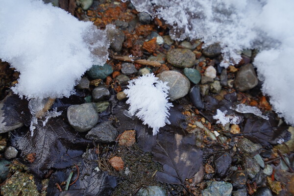 さらにフロストフラワーも発見.岸に上がってきたところで下に小さな沢があるっぽく,そこの水蒸気で育ったっぽい.糠平湖は色々見られて面白い.
