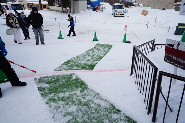 10時半に開園したら直ぐにペンギンの散歩コース脇の待機列へ並ぶ.西門は散歩コースがすぐ目の前なので便利.このままここで 30分待機.なお,赤線の内側が散歩コースで進入禁止で,緑のマット部分が人間の移動用.