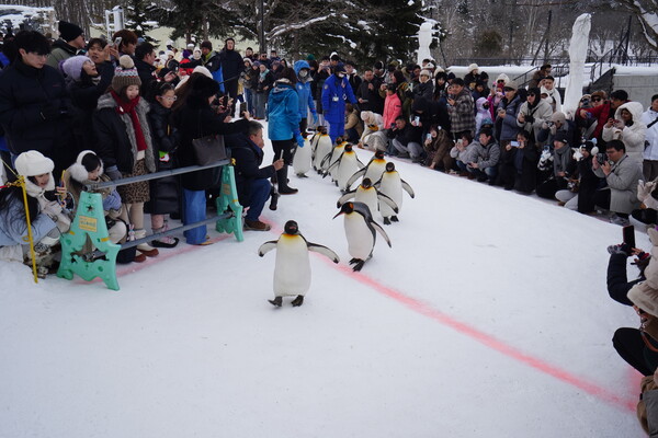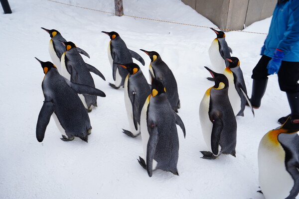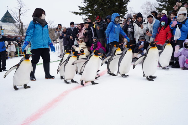 旭山動物園でペンギンの散歩を見る