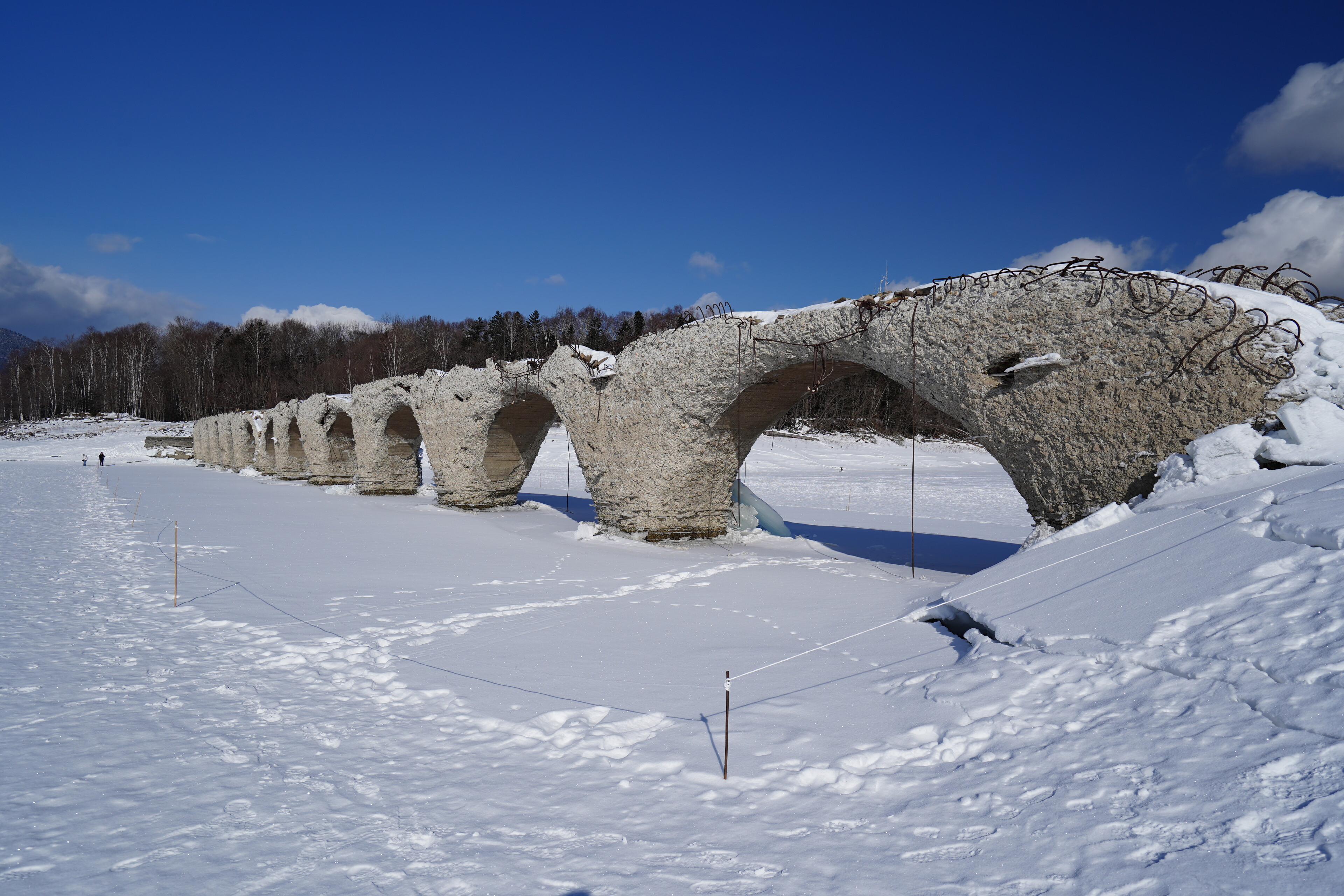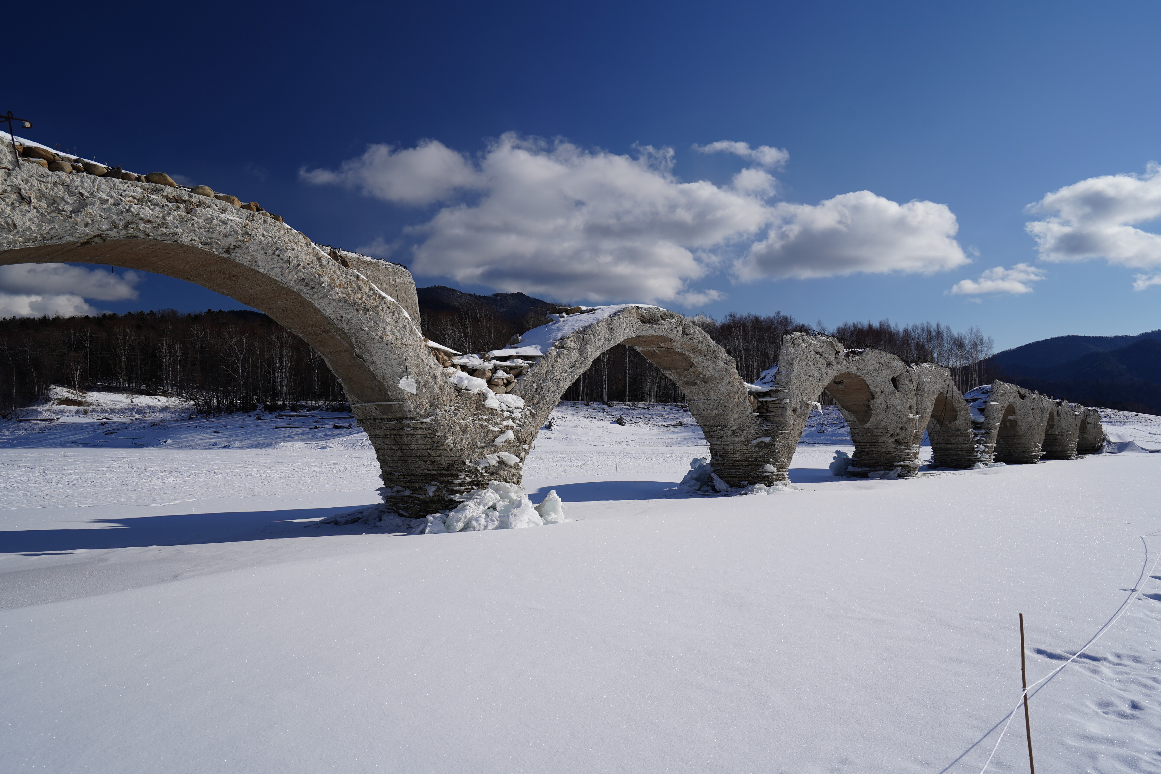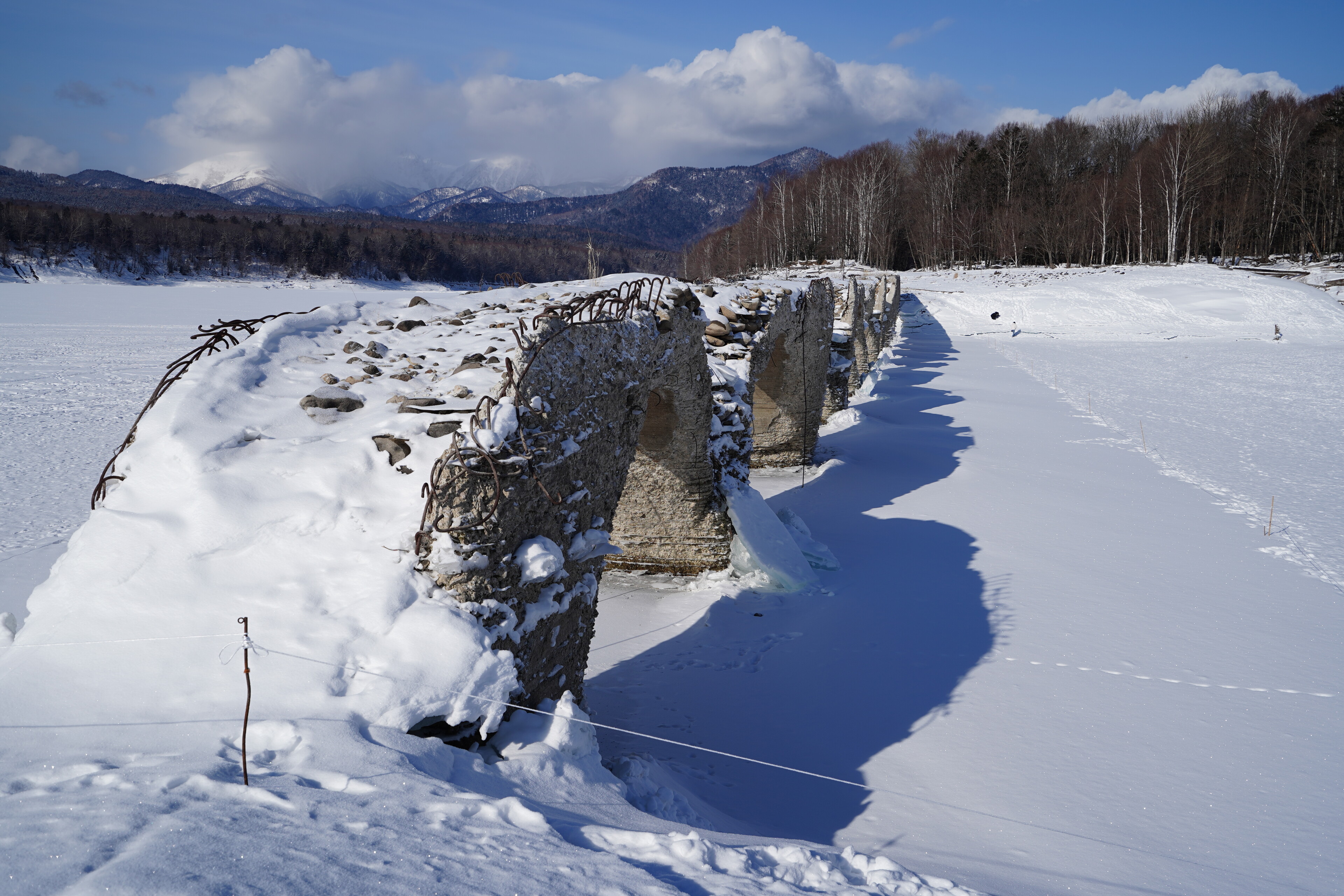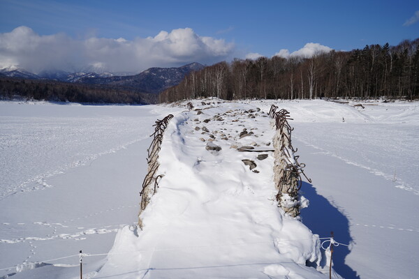 崩壊の進んでるタウシュベツ川橋梁の様子見に糠平湖へ行ってみた.大津海岸から移動してきて 9時半に五ノ沢の駐車スペースに到着.前回よりはっきりしたトレースを辿って迷わず湖面まで移動.