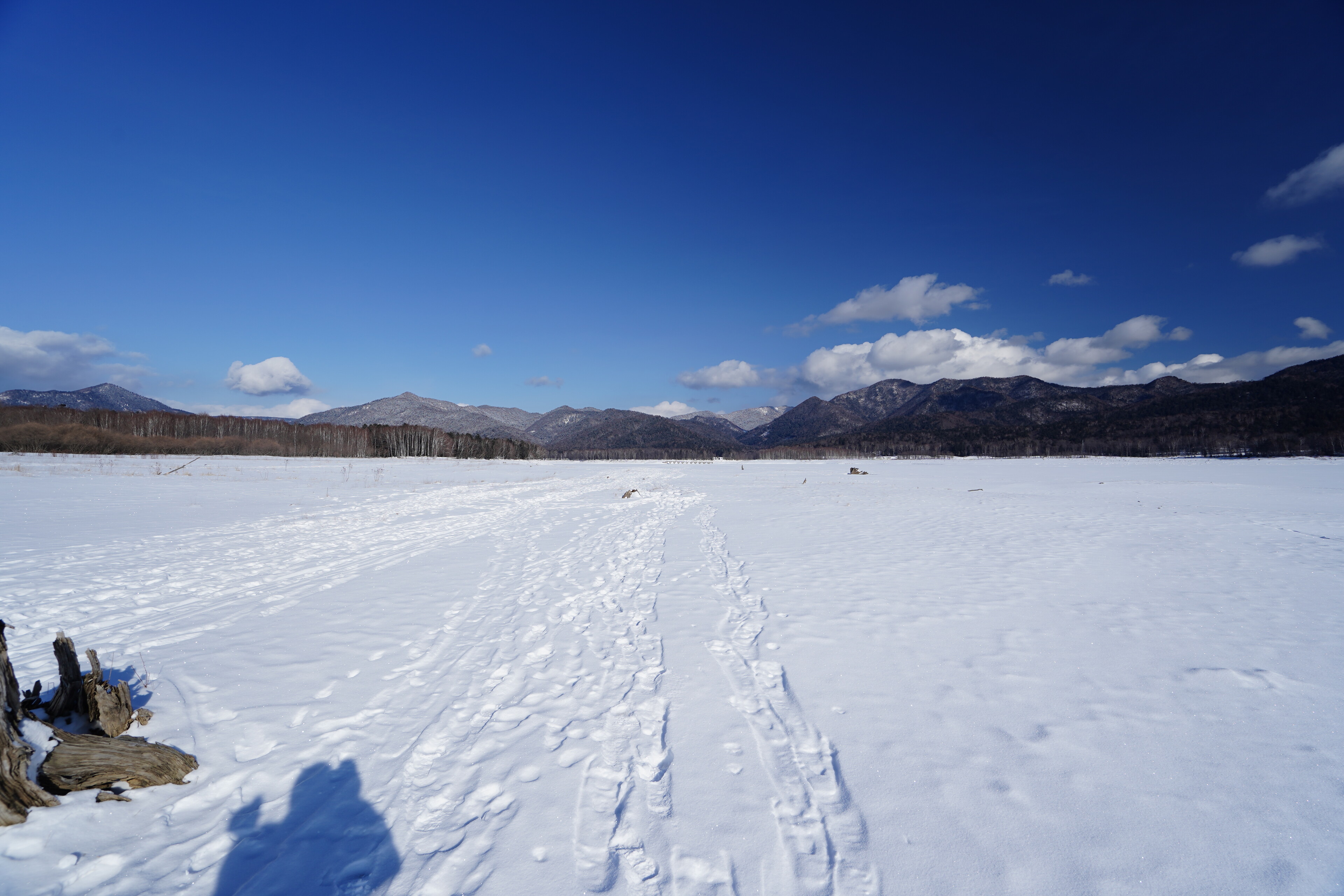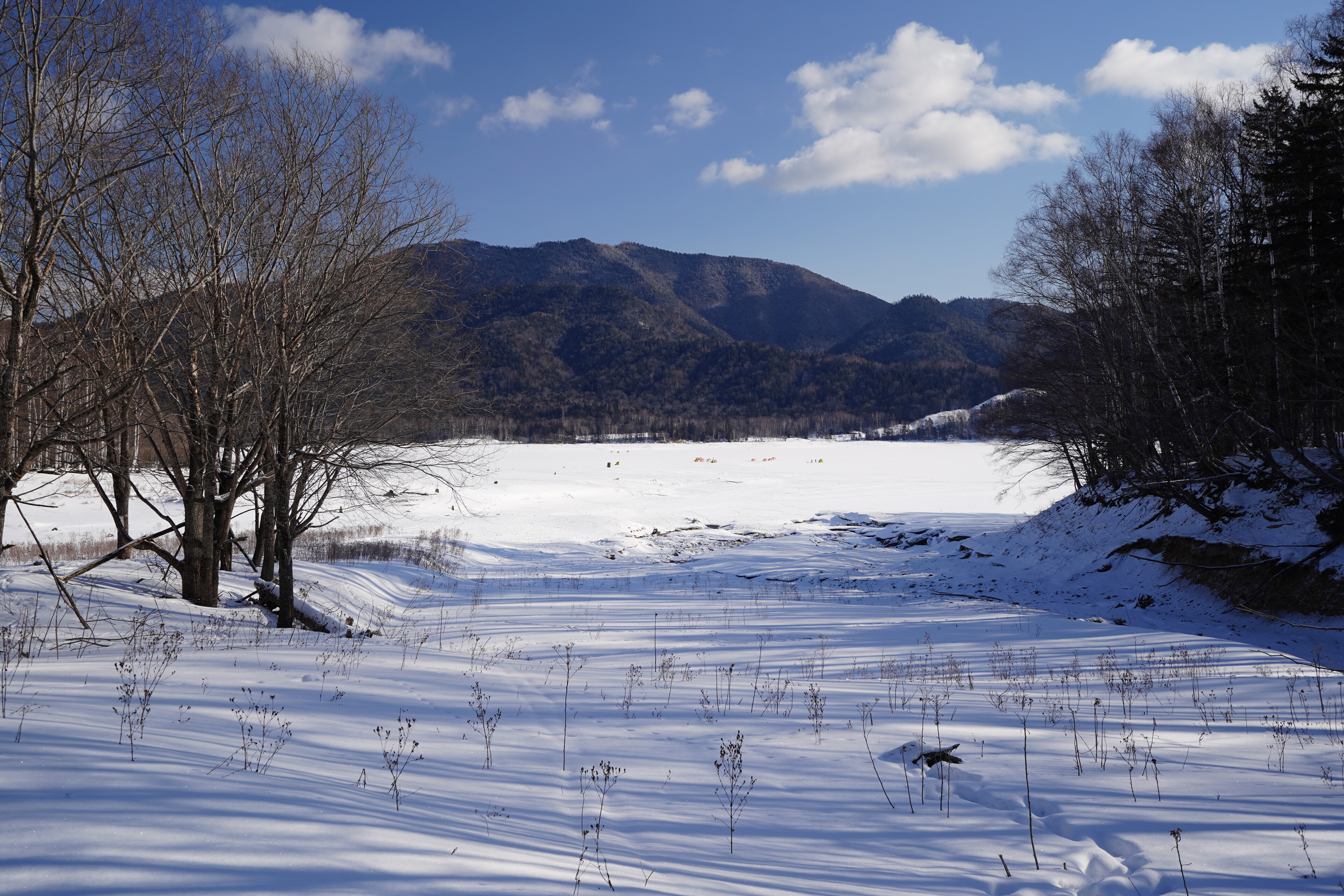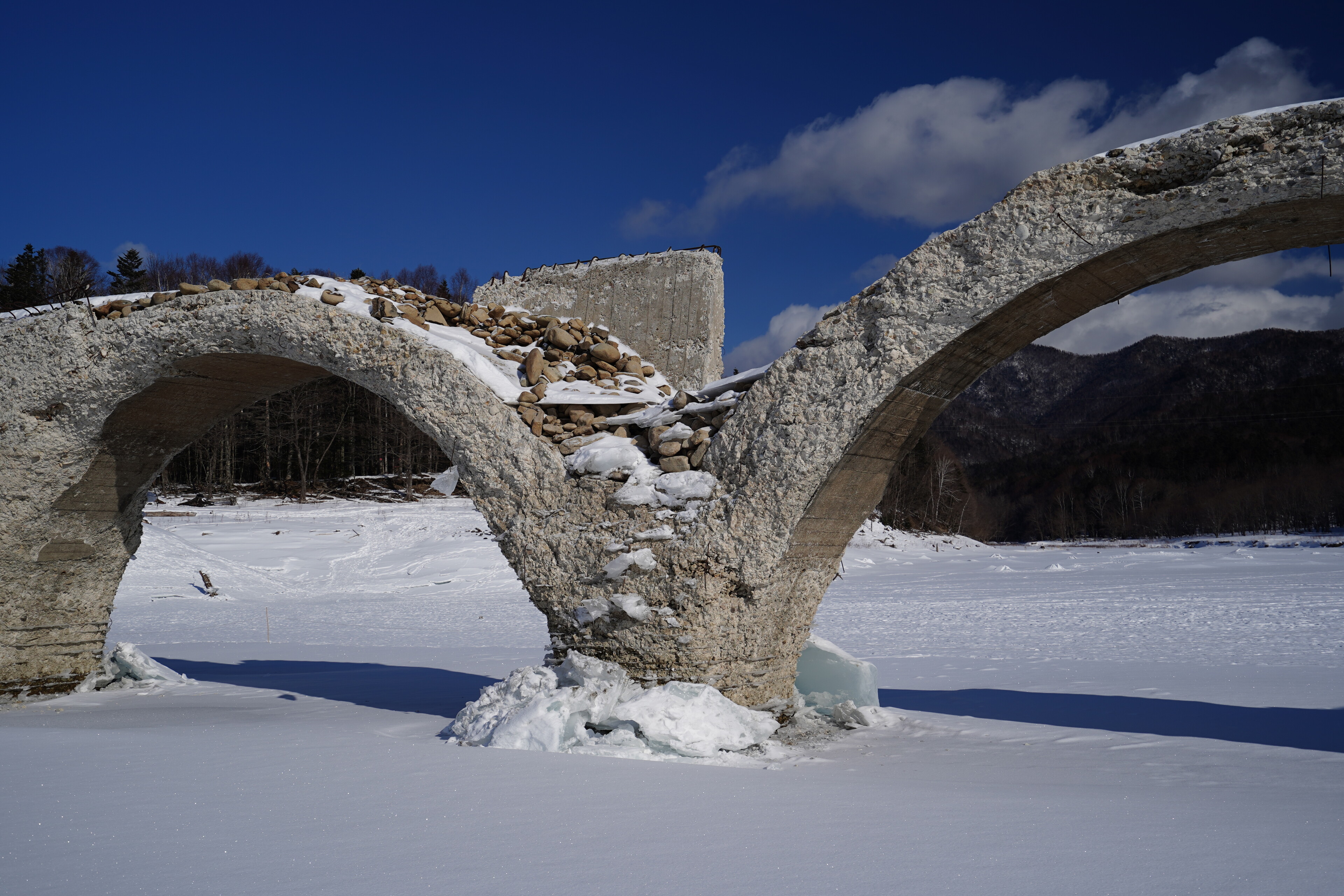 崩壊の進んでるタウシュベツ川橋梁の様子見に糠平湖へ行ってみた.大津海岸から移動してきて 9時半に五ノ沢の駐車スペースに到着.前回よりはっきりしたトレースを辿って迷わず湖面まで移動.