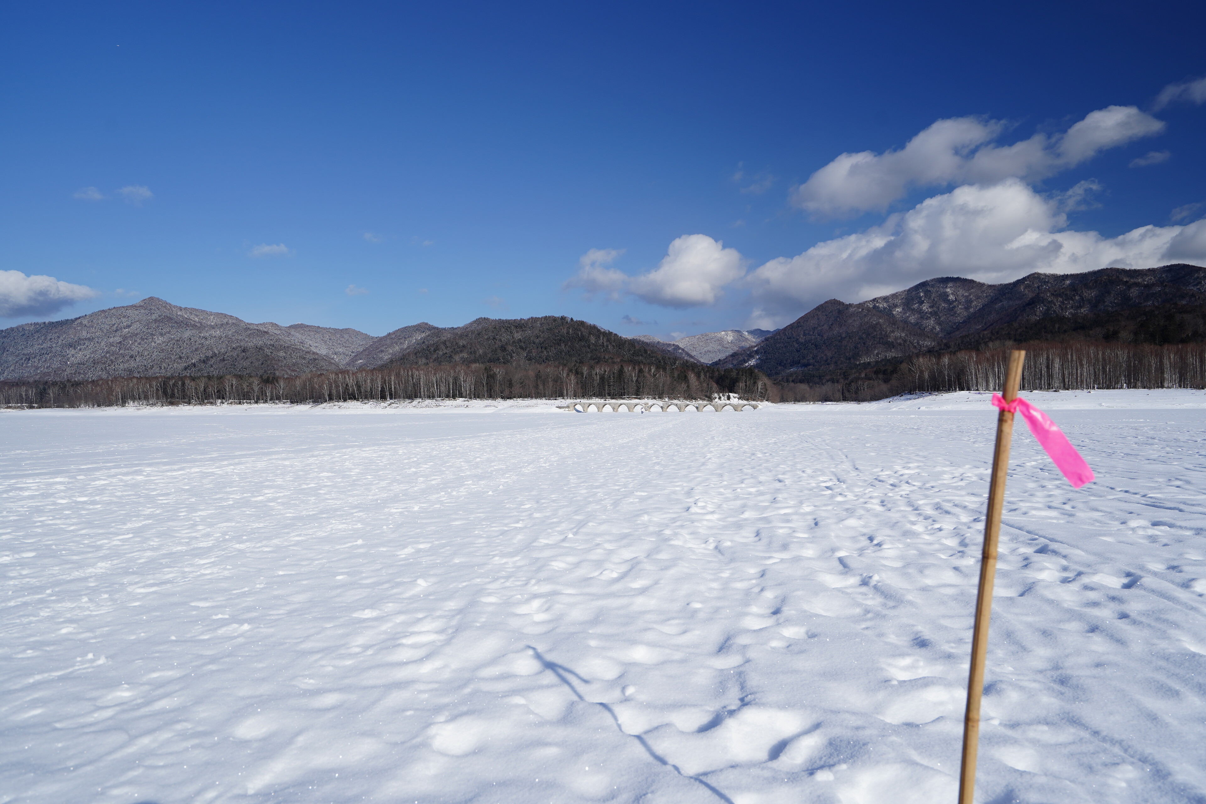 そして湖面上をタウシュベツ川橋梁へ向けて移動.一定間隔で立ってるポールがルートの案内になっていて,その岸側に沿って踏み跡が続いてた.