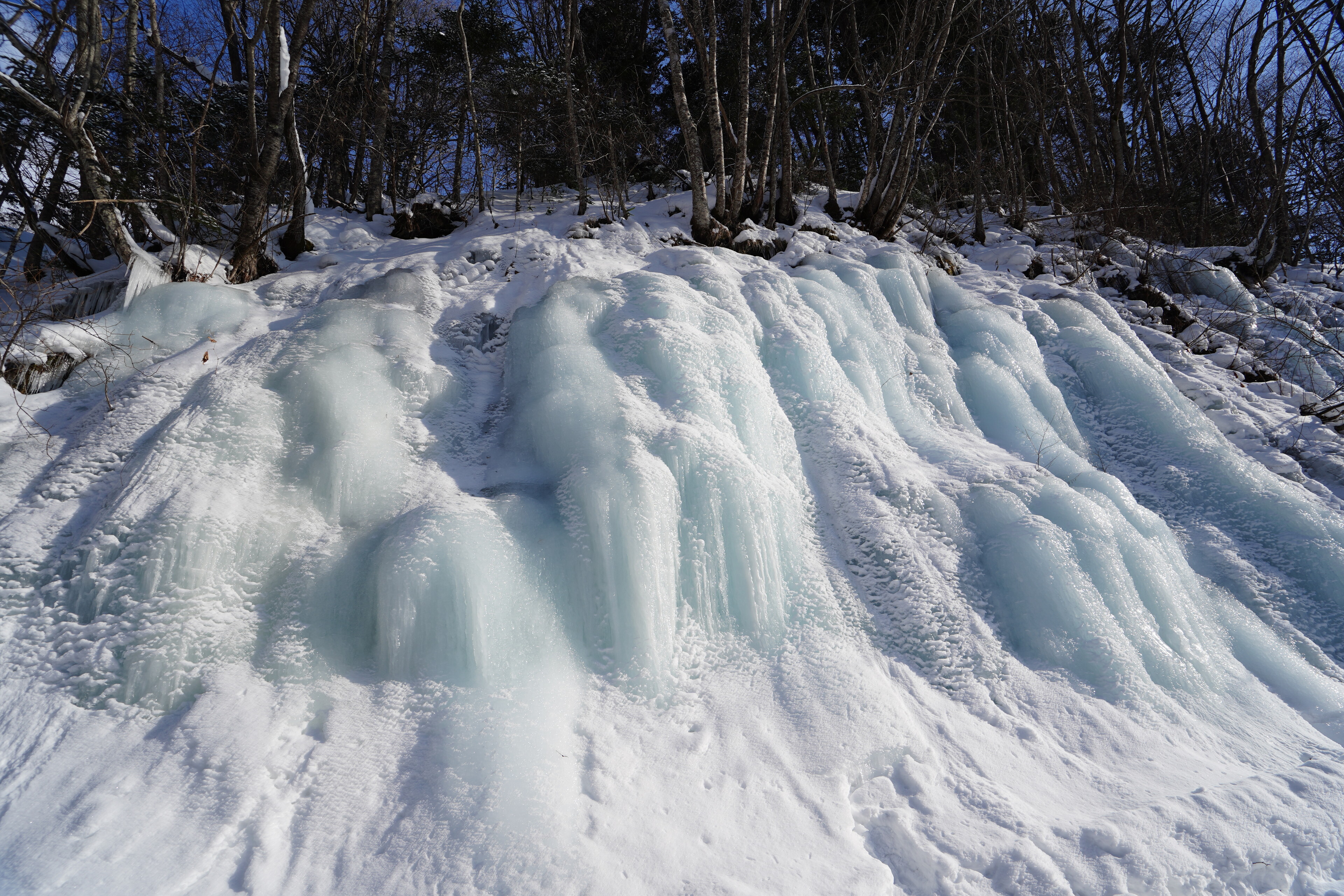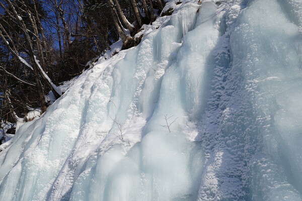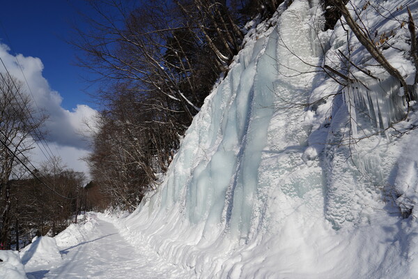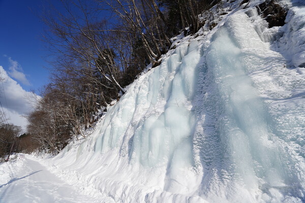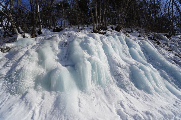そして青い滝とご対面.林道に面した崖が氷瀑になっている.周りの雪と比べるとたしかに青い.湧き水が凍ったものらしい.