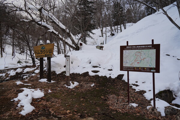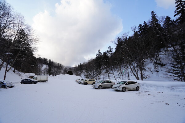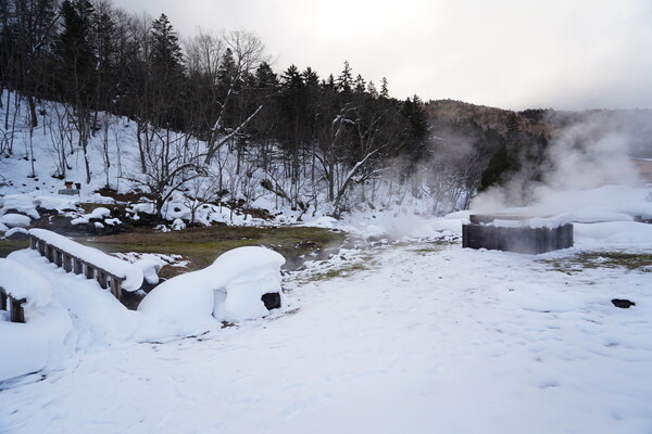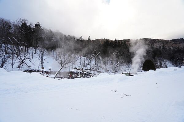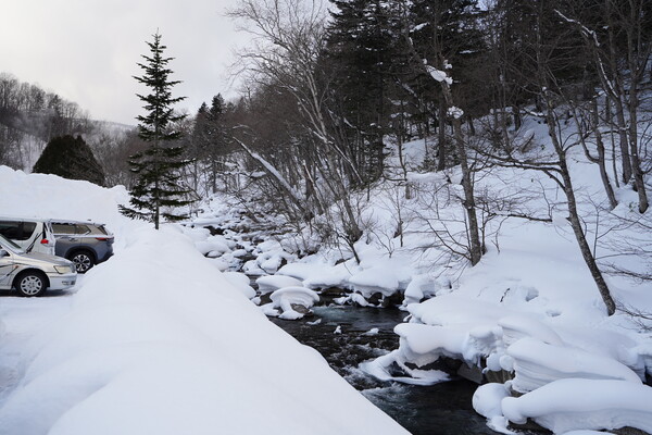 東大雪荘の手前の道端から湯気が登ってて何かありそうな感じだったので見に行ってみた.ちょうど対面にトイレ(冬季閉鎖中)と駐車スペースもあったのでそこに車を止めて.