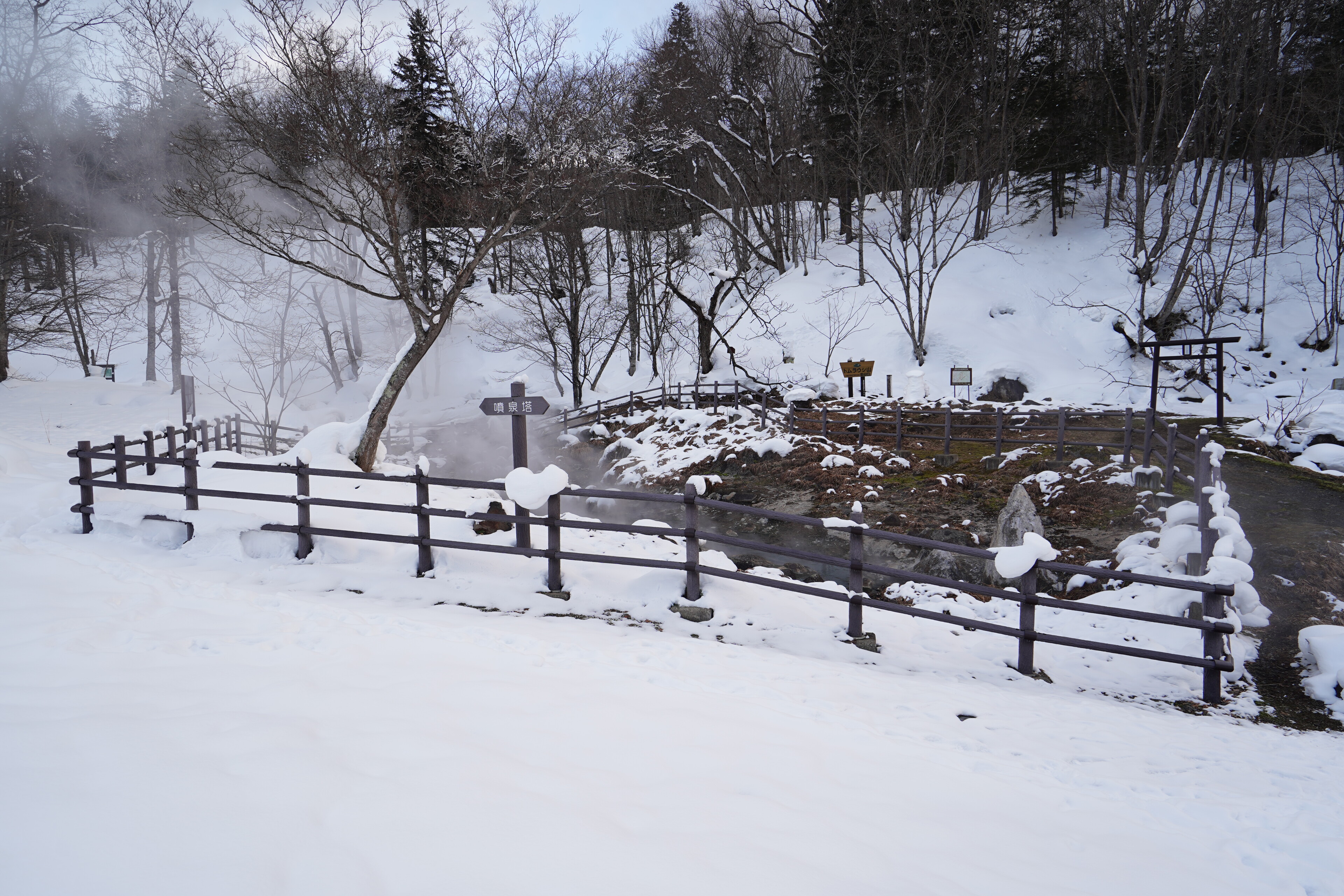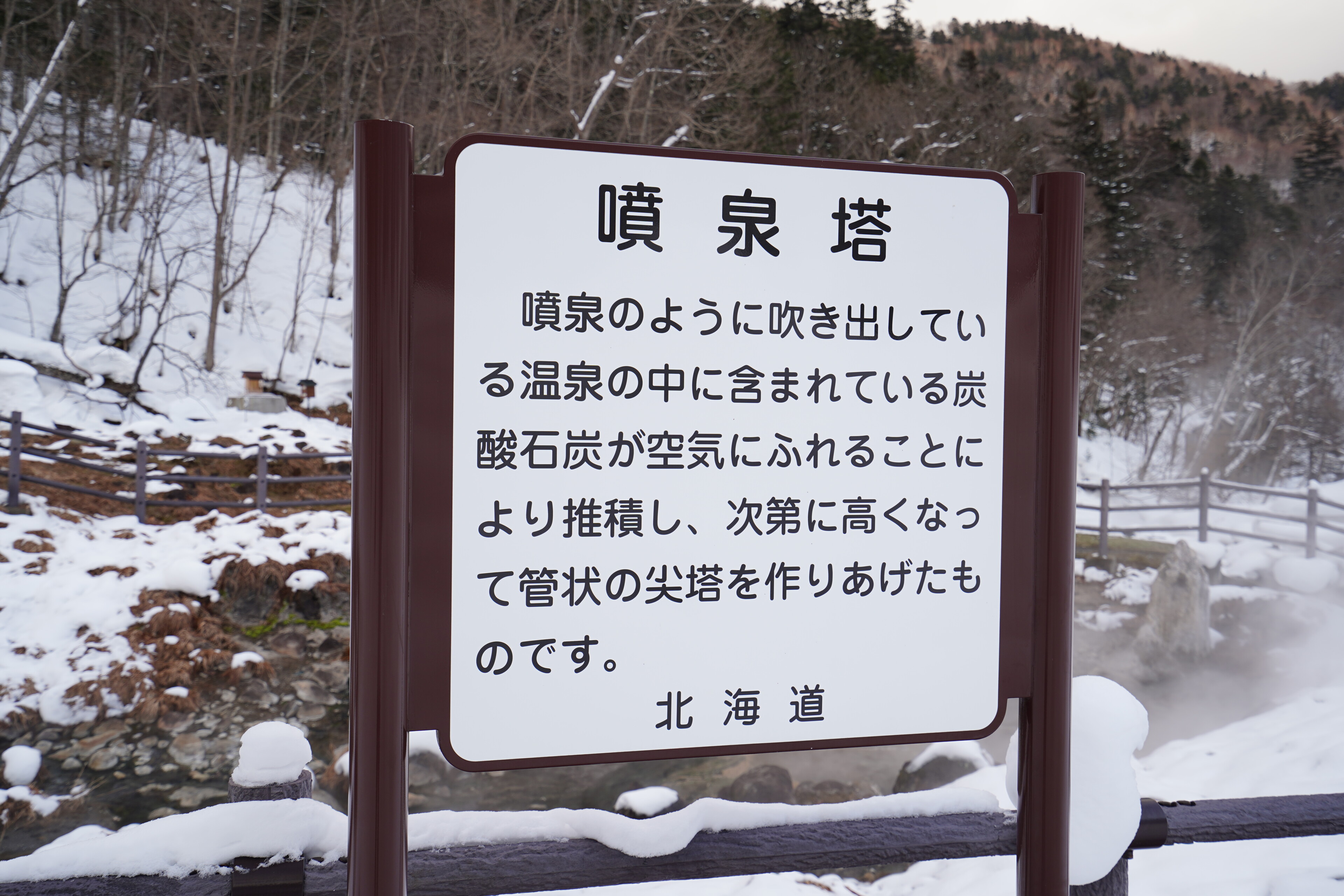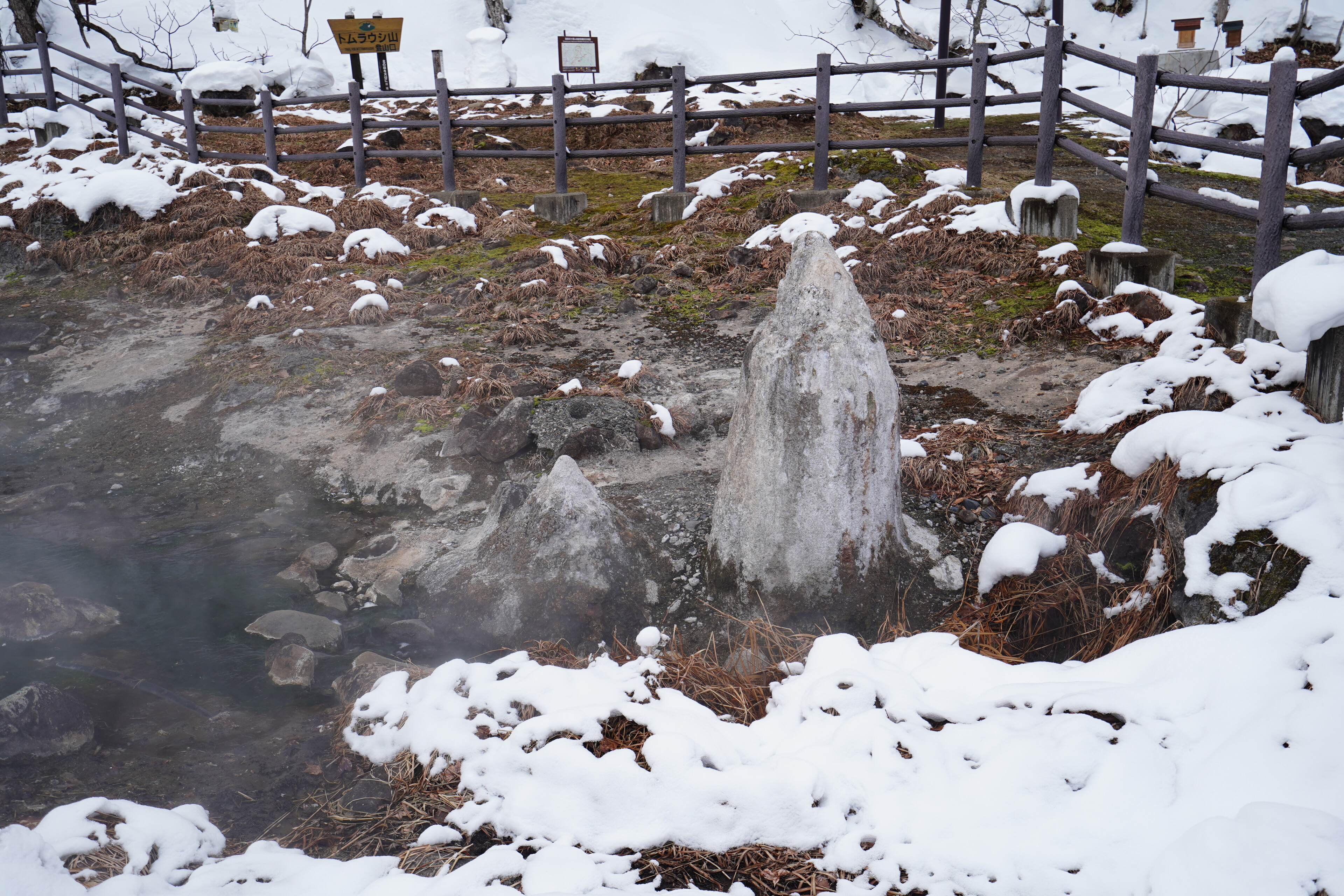 んで,あったのは噴泉塔.作に囲まれた中にある.その周辺で温泉が湧いてて湯気を上げながら東大雪荘の方に流れてってた.